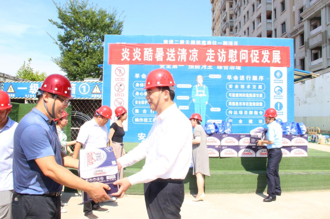 7月26日下午,冒着近40度的高温,集团董事长周君,工会主席、副总经理张钢平,副总经理连丹一行代表集团党委、工会、经营班子来到溧水天禧明庭项目部慰问施工现场的广大职工,并发放防暑降温饮品和日用品。