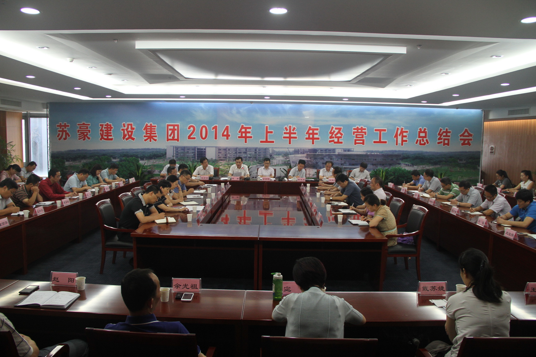 7月25日上午,苏豪建设集团在苏豪国际广场A座五楼第四会议室召开2014年上半年经营工作总结会,对上半年工作进行总结和分析,并对下半年工作进行部署和安排。控股集团副总裁、建设集团党委书记余亦民参加会议并做重要讲话,建设集团本部全体员工和子公司及项目负责人参加会议。周君总经理代表集团经营班子作《坚定信心、破冰前行,确保完成年度目标任务》工作报告,吴廷昌董事长传达了控股集团上半年经济运行分析会议精神。