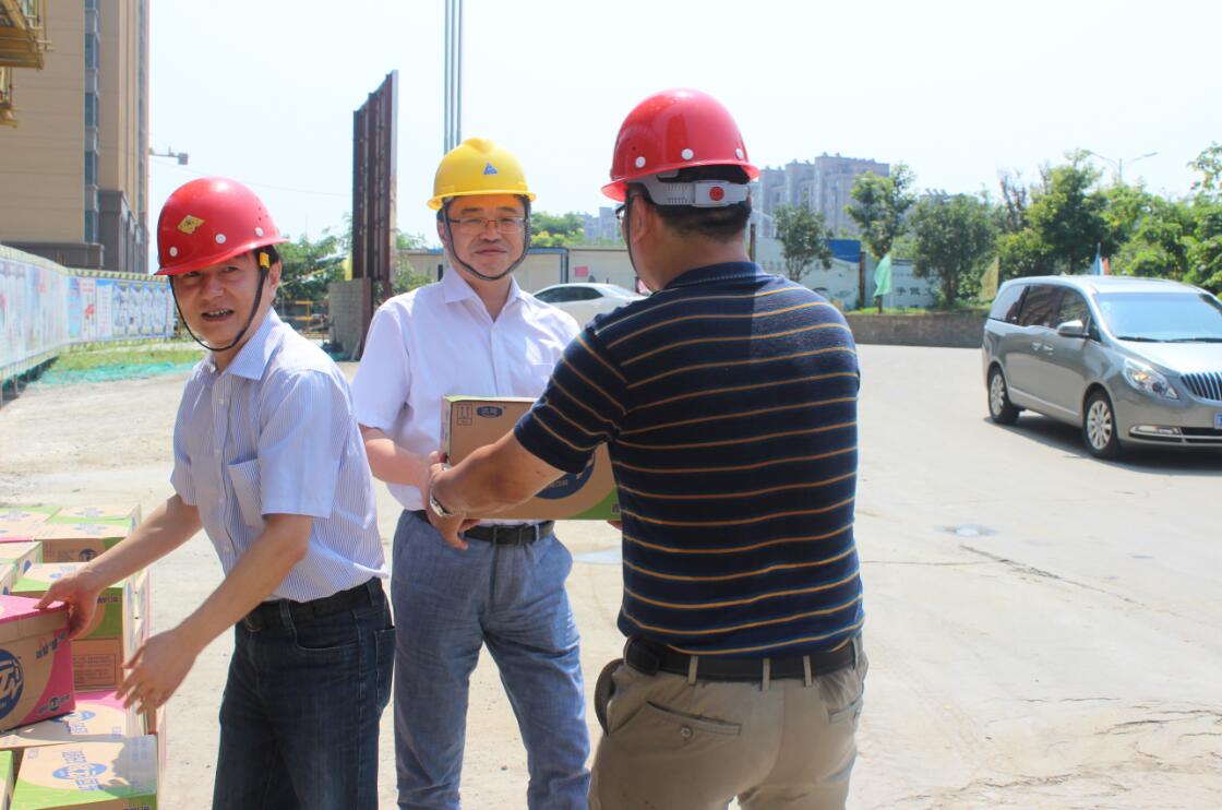 根据控股集团上半年经济工作会议精神,按照建设集团党委的统一部署,7月29日上午,建设集团董事长、党委副书记周君,总经理、党委副书记孙新山,副总经理张钢平一行赴溧水爱涛置地公司,慰问奋战在施工现场的一线职工,并发放防暑降温饮品,为广大职工“送清凉”。 周君指出,当前正值酷暑时节,置地公司并监理单位、施工单位要合理安排作息时间,将安全管理责任层层落实到一线,落实到人头,切实做好防暑降温各项工作,确保平安度夏。