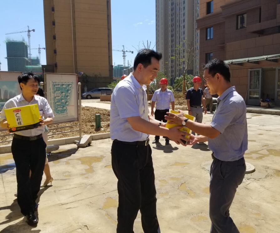 7月25日,建设集团董事长、党委副书记周君、副总经理张钢平一行冒着近四十度的高温前往溧水天岳城项目为员工送去清凉和关爱。周君董事长代表集团党委、工会为员工们赠送了防暑降温药品和饮料等清凉物品。慰问活动结束后,周董事长听取了项目进展情况汇报 并强调,宁镇区域当前的工作重点一是要围绕集团下达的2017年经营指标,做好房屋交付、清盘等收尾工作;二是要持续强化安全生产意识,彻底排查安全隐患,狠抓安全生产责任落实,确保各项工作稳妥推进;三是各级领导干部和员工要有勇于担当的精神,做到守土有责、守土尽责。